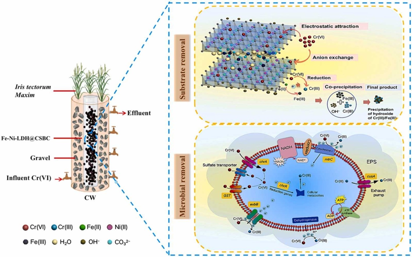 该研究成功制备了Fe-Ni层状双氢氧化物改性小龙虾壳生物炭基质(Fe-Ni-LDH@CSBC),并将其引入人工湿地(CW)中,通过“基质-微生物”双途径探究其对六价铬(Cr(VI))的去除机制。研究结果表明:(1)Fe-Ni-LDH@CSBC对Cr(VI)的平衡吸附容量在初始浓度(C₀)为10 mg/L 和20 mg/L时分别可达1058.48 mg/kg 和1394.59 mg/kg。(2)投加Fe-Ni-LDH@CSBC的CW对化学需氧量(COD)、总氮(TN)、总磷(TP)及Cr(VI)有较高的去除效率:进水Cr(VI)浓度为50 mg/L时,上述指标去除率分别达到72.9%、66.8%、79.6%和99.3%。(3)Fe-Ni-LDH@CSBC可促进胞外聚合物(EPS)的分泌(570.6 mg/g VSS),不仅有利于吸附水体中的Cr(VI),还能延缓或阻止Cr(VI)进入微生物体内。此外,该改性基质通过提高细胞色素c(cytochromec)、电子传递系统活性(ETSA)及还原型辅酶 Ⅱ(NADH)的水平,强化了胞外电子传递(EET)过程,从而显著提升了Cr(VI)的还原去除效果。(4)宏基因组测序结果显示,Fe-Ni-LDH@CSBC可提高人工湿地中抗性微生物(如分枝杆菌属Mycobacterium、生丝微菌属Hyphomicrobium)的丰度;同时,与Cr(VI)还原相关的关键功能基因(chrR、GST、czcD、zitB、merR)、电子传递基因(mtrC、fbpC、insB、afuC)及转运蛋白基因(rhtC、pcoB、bpeT、pecM、chrA、exbB)的相对丰度也显著增加。