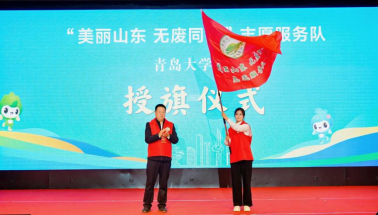 活动现场,2026年“美丽山东 无废同行”志愿服务10项活动计划正式发布。由我院学生组建的“美丽山东 无废同行”志愿服务队青岛大学分队接受山东省生态环境厅机关党委专职副书记马运文授旗。